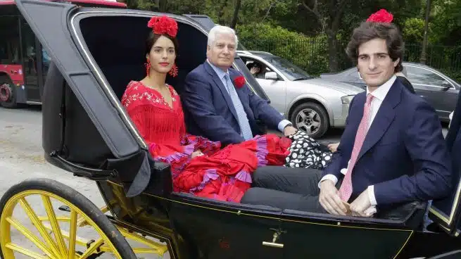 Tampoco faltaron los carruajes, como aquel que llevaba hacia el festejo al duque de Alba, su hijo y la novia de este, Sofía Palazuelo. No todo fueron vestidos de flamenca o carruajes tirados por caballos. Ana Rosa Quintana, por ejemplo, eligió un atuendo mucho más sencillo para posar junto a su marido, Juan Muñoz.