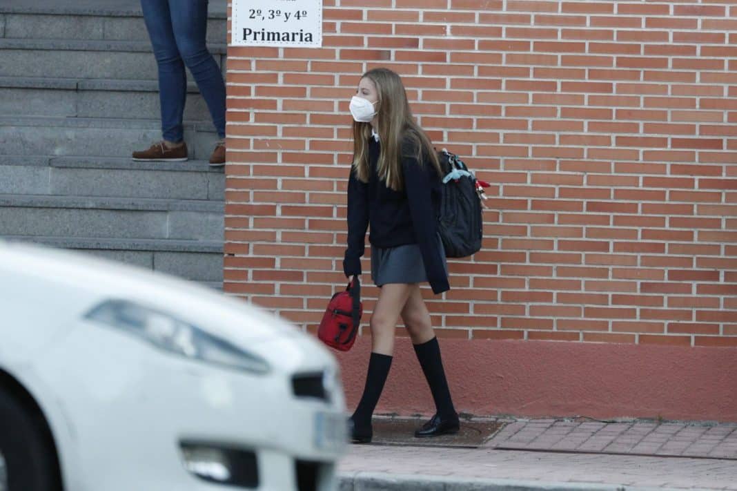 >La Infanta Sofía ha llegado a su primer día de curso ocupando el sitio del copiloto de un vehículo conducido por el Rey. Doña Letizia ha preferido pasar desapercibida ocupando la parte trasera del coche. Con el pelo suelto y una mascarilla FFP2, la hija menor de los monarcas ha accedido en coche hasta el interior del colegio.