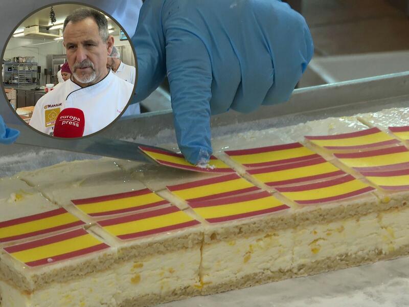 1500 pasteles elaborados por la popular Pastelería Manacor, con una base de bizcocho de almendras y crema diplomática de naranja, y un adorno en la parte superior con los colores de la bandera de España logrado gracis a gelatina de frambuesa y limón.