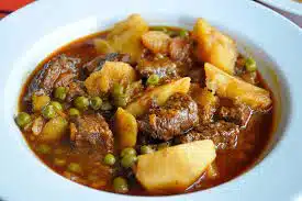 - Una vez que la carne esté tierna, agrega las patatas cortadas en trozos y los guisantes a la olla.