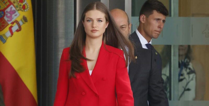 Deslumbrante, la princesa demostró que no solo es la perfecta heredera al trono de Felipe VI, sino que también lo es del estilo y la elegancia de la Reina Letizia, a la que hizo un nuevo guiño con su look en el color fetiche de la monarca. Apostando todo al rojo, la Princesa Leonor lució un impecable traje ‘rojo España’ que le sentaba como un guante. Un dos piezas con blazer entallada con botonadura cruzada y dos falsos bolsillos frontales, y pantalón con el bajo ligeramente acampanado. Un look sofisticado y muy favorecedor que completó con un top blanco de escote recto y zapatos de tacón en color beige con el empeine al aire, además de un collar dorado.