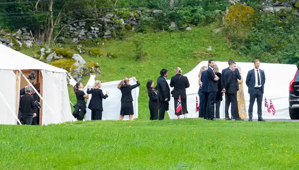 Desde el inicio, se sabía que la pareja haría lo imposible para proteger los derechos de transmisión de su boda. Para ello, decidieron prohibir el uso de móviles durante la ceremonia, buscando evitar cualquier filtración no autorizada. Lo que no se esperaba era el nivel de secretismo al que llegarían para resguardar su “sí, quiero”. La pequeña localidad de Geiranger, situada en la pintoresca costa noruega, fue testigo de un episodio surrealista cuando Marta Luisa y Durek se presentaron en el lugar escondidos tras sábanas blancas para evitar los flashes de los paparazzi.